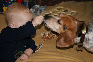 He still loves Baby Einstein dvd's and books.. ( all books) and we've been playing a lot with Tanners old hand puppets lately which he likes. He's starting to like cars and trucks like his cousin Chase. He wants to be outside whenever he can be, so I am glad the weathers warming up.. finally! With Tanners schedule of baseball and track starting now he'll get alot of outdoor time.